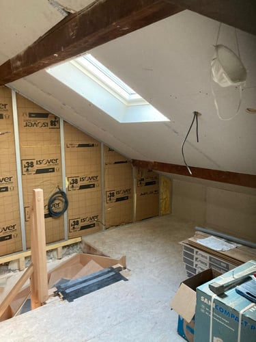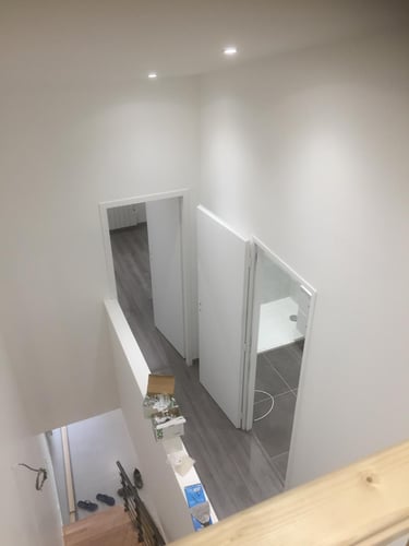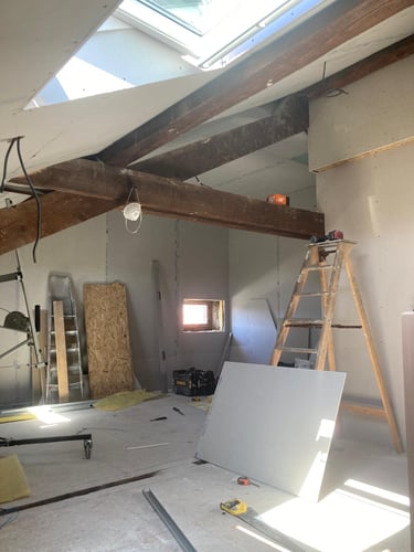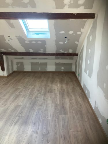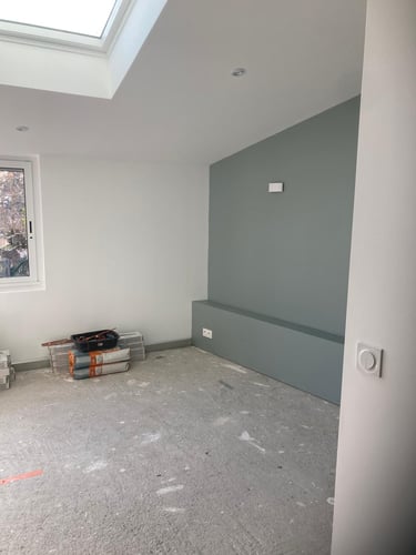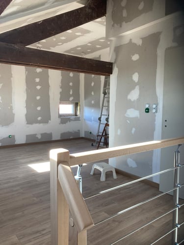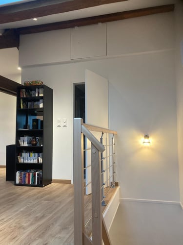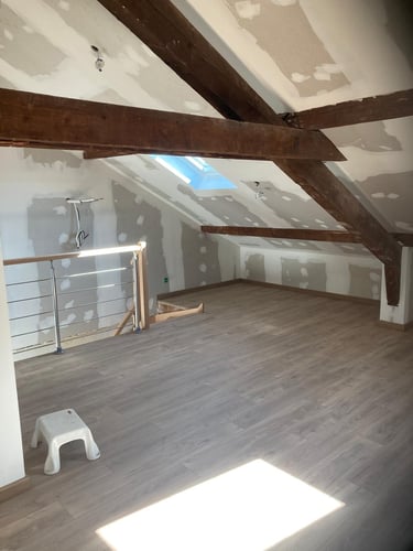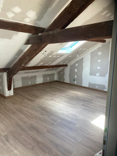 Découvrez l’aménagement des combles de cette maison, avec la création de nouveaux volumes en plaques de plâtre pour exploiter pleinement l’espace sous toiture. MDV SERVICES a assuré les finitions peinture pour un rendu lumineux, propre et immédiatement prêt à vivre.