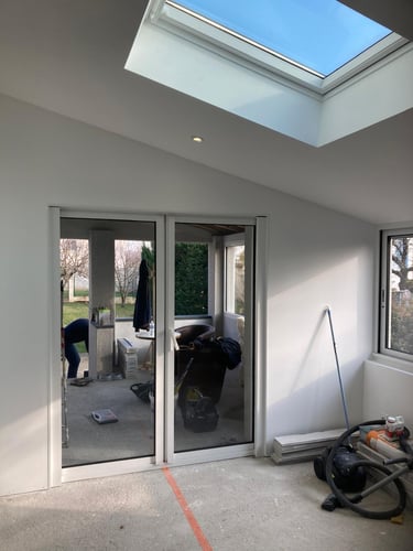 Découvrez l’aménagement de cette extension de maison, réalisé en placo, peinture et électricité pour intégrer parfaitement le nouvel espace au reste de l’habitation. MDV SERVICES y a installé des luminaires décoratifs, des appliques murales et des spots encastrés au plafond afin de créer une ambiance chaleureuse et contemporaine.