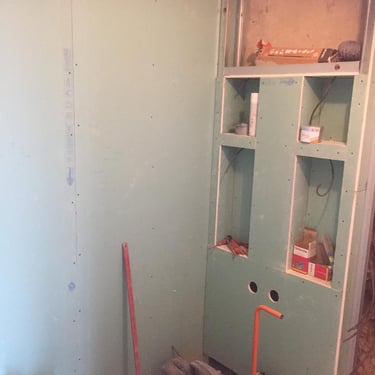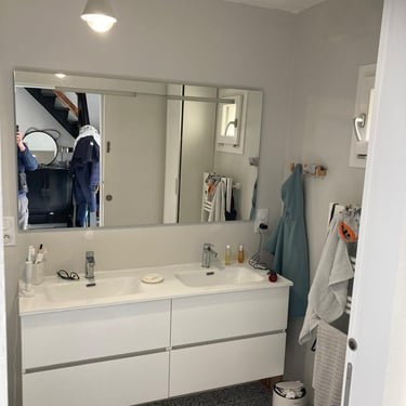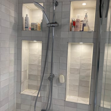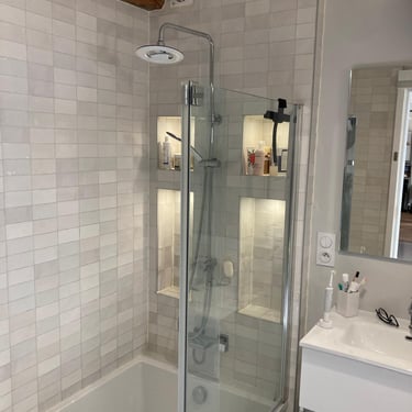 Découvrez la rénovation de cette salle de bain avec la création d’un doublage de mur et d’une niche en placo intégrant l’ensemble des réseaux électriques. MDV SERVICES a mis en valeur la niche par des spots encastrés, alliant fonctionnalité, esthétisme et confort d’éclairage au quotidien.