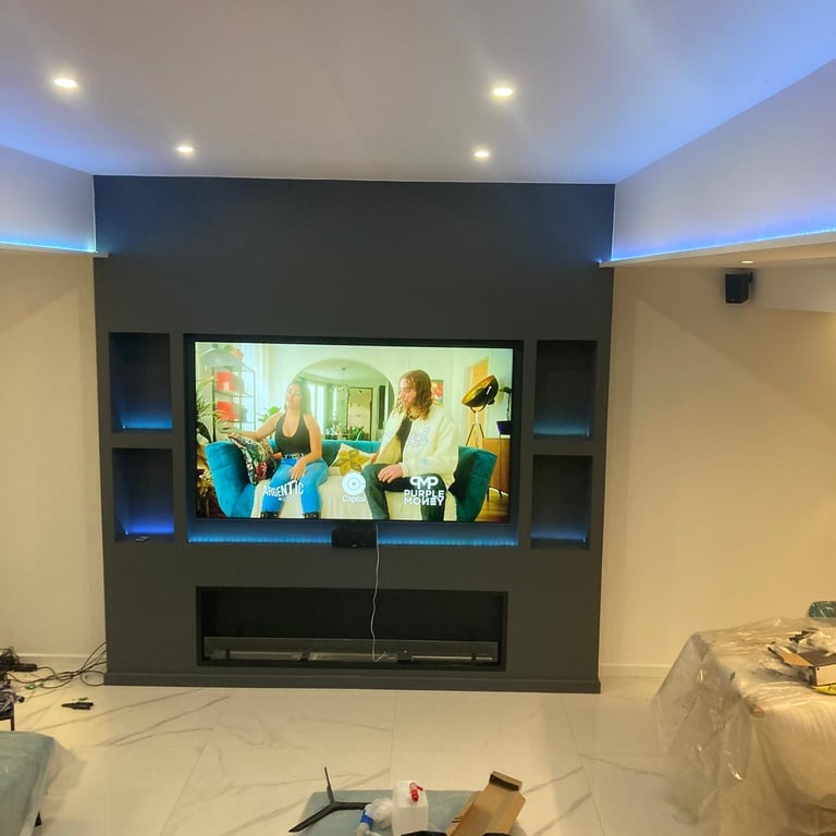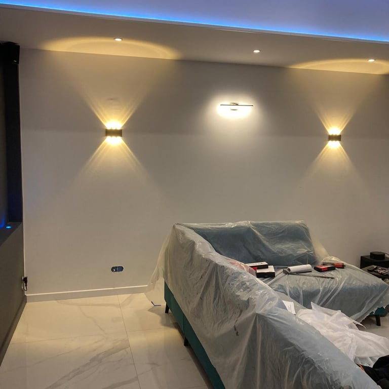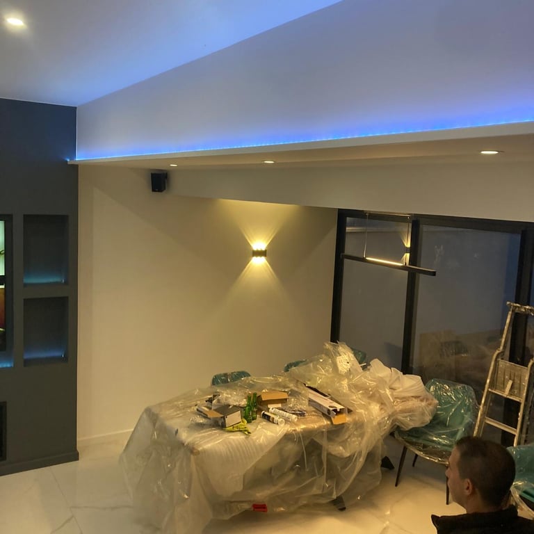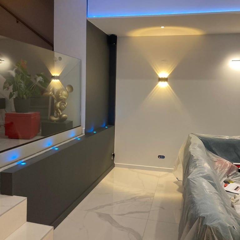 Découvrez l’éclairage décoratif de ce salon, combinant spots encastrés, rubans LED et appliques murales pour structurer l’espace et créer différentes ambiances. MDV SERVICES a travaillé sur les volumes, les effets de lumière et le confort visuel afin d’obtenir un intérieur chaleureux, moderne et convivial.